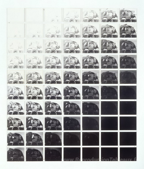 Nous vous proposons une reproduction artisanale sur toile du célèbre tableau 'Caméra enregistrant son propre état (7 ouvertures, 10 vitesses, ' de John Hilliard, provenant du Musée de la Reproduction.