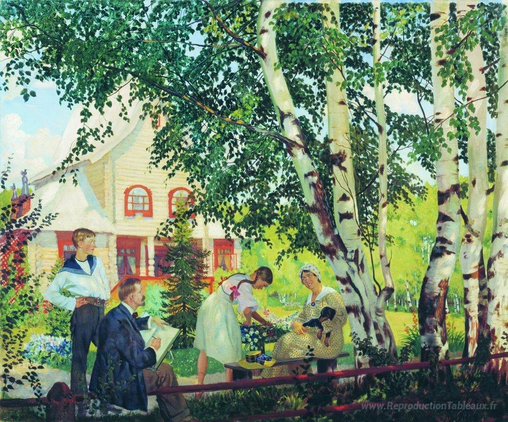 Nous vous proposons une reproduction artisanale sur toile du célèbre tableau 'À la maison' de Boris Kustodiev, provenant du Musée de la Reproduction.