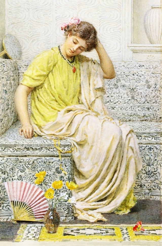 Nous vous proposons une reproduction artisanale sur toile du célèbre tableau 'Épingles à cheveux' de Albert Joseph Moore, provenant du Musée de la Reproduction.