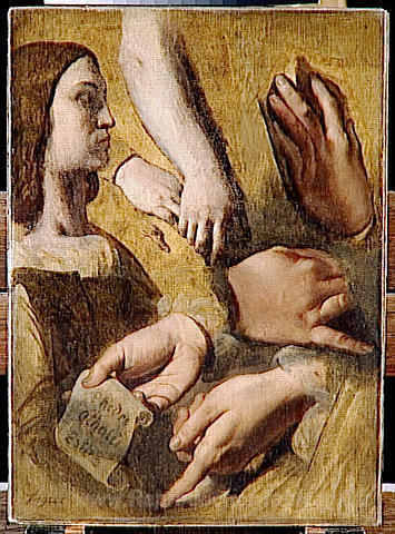 Nous vous proposons une reproduction artisanale sur toile du célèbre tableau 'Étude pour l'apothéose du profil d'Homère Raphael Hands of Apell' de Jean Auguste Dominique Ingres, provenant du Musée de la Reproduction.