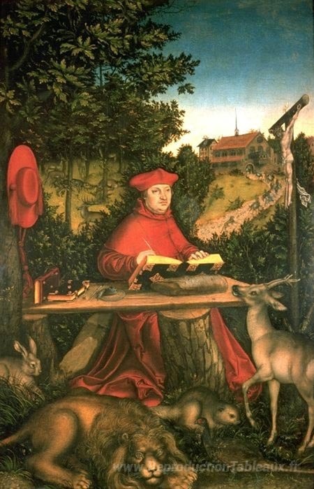Nous vous proposons une reproduction artisanale sur toile du célèbre tableau 'Albrecht de Brandenburg comme Saint-Jérôme dans son étude' de Lucas Cranach the Elder, provenant du Musée de la Reproduction.