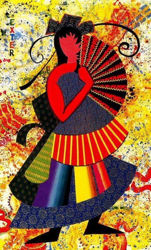 Nous vous proposons une reproduction artisanale sur toile du célèbre tableau 'Alexandra Exter (mon ventilateur est un demi-cercle)' de Miriam Schapiro, provenant du Musée de la Reproduction.