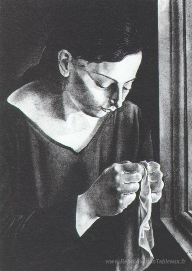 Nous vous proposons une reproduction artisanale sur toile du célèbre tableau 'Ana Maria, couture' de Salvador Dali, provenant du Musée de la Reproduction.