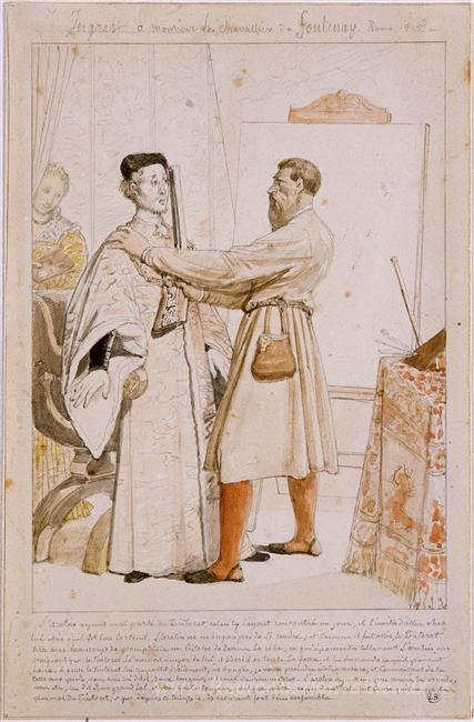 Nous vous proposons une reproduction artisanale sur toile du célèbre tableau 'Aretino et Tintoretto' de Jean Auguste Dominique Ingres, provenant du Musée de la Reproduction.
