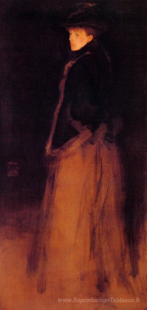 Nous vous proposons une reproduction artisanale sur toile du célèbre tableau 'Arrangement en noir et marron: la veste en fourrure' de James McNeill Whistler, provenant du Musée de la Reproduction.