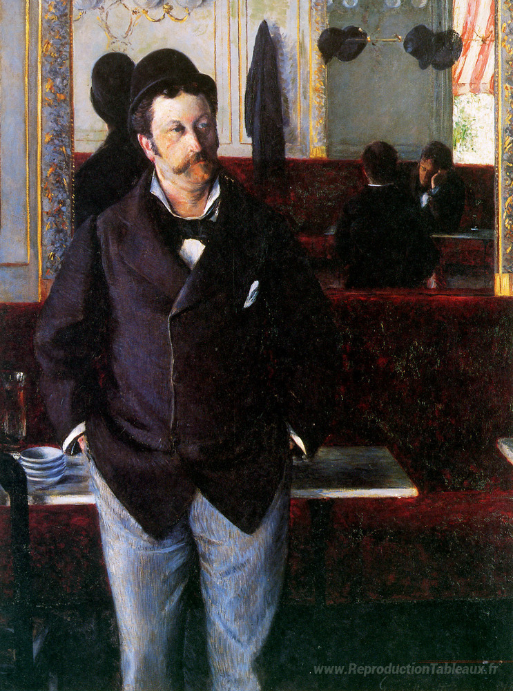 Nous vous proposons une reproduction artisanale sur toile du célèbre tableau 'Au café, Rouen' de Gustave Caillebotte, provenant du Musée de la Reproduction.