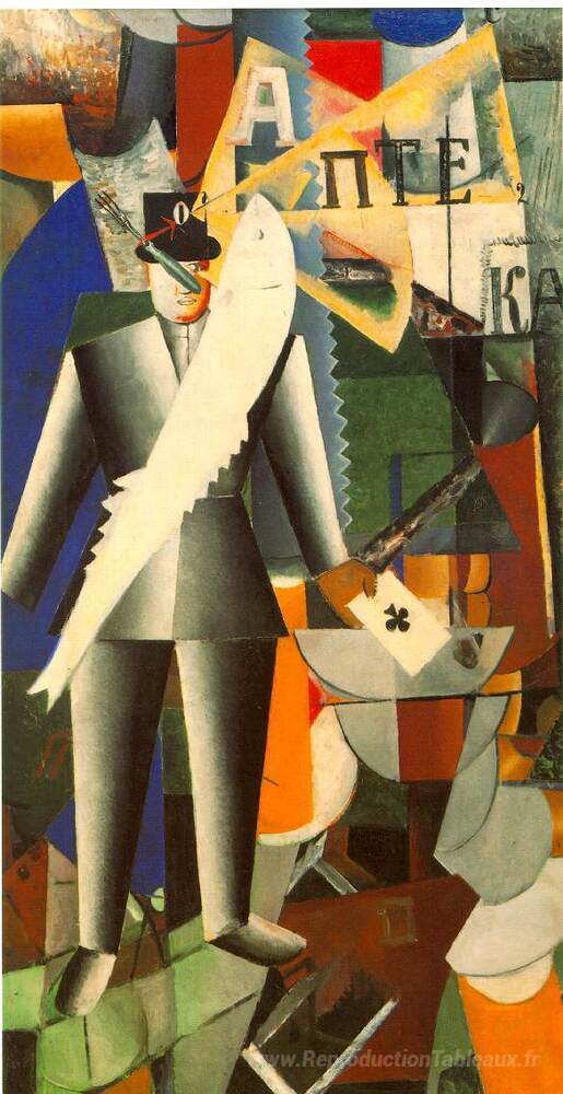 Nous vous proposons une reproduction artisanale sur toile du célèbre tableau 'Aviateur' de Kazimir Malevich, provenant du Musée de la Reproduction.