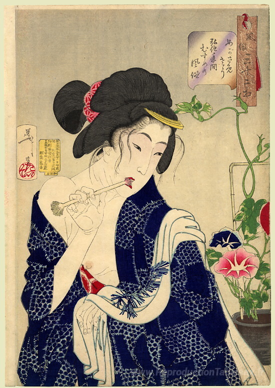 Nous vous proposons une reproduction artisanale sur toile du célèbre tableau 'Avoir l'air de se réveiller - l'apparition d'une jeune fille de ' de Tsukioka Yoshitoshi, provenant du Musée de la Reproduction.