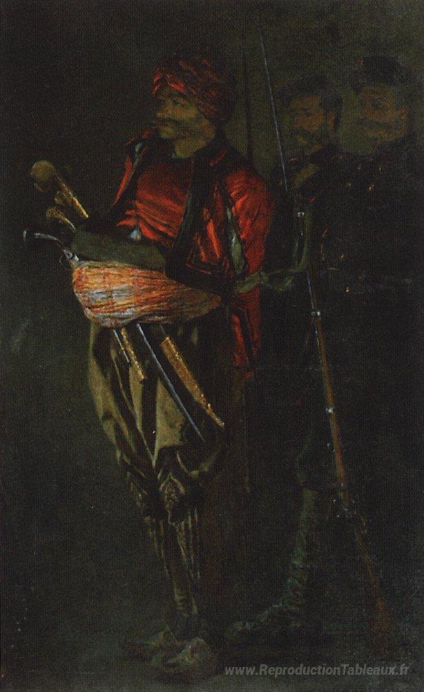 Nous vous proposons une reproduction artisanale sur toile du célèbre tableau 'Bashi-Bazouk (Albanais)' de Vasily Vereshchagin, provenant du Musée de la Reproduction.