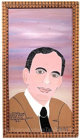 Nous vous proposons une reproduction artisanale sur toile du célèbre tableau 'Ben Riegel' de Howard Finster, provenant du Musée de la Reproduction.