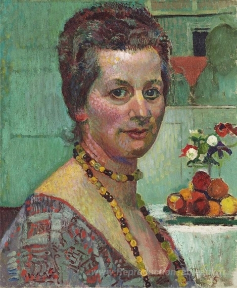 Nous vous proposons une reproduction artisanale sur toile du célèbre tableau 'Bildnis Frau Amiet' de Cuno Amiet, provenant du Musée de la Reproduction.