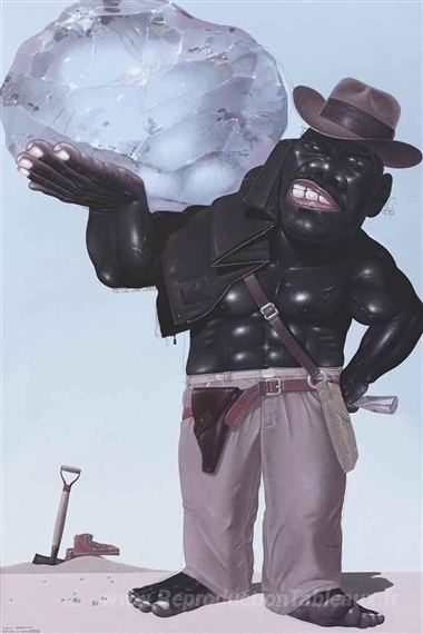 Nous vous proposons une reproduction artisanale sur toile du célèbre tableau 'Blekik Jones et Soekarno's Treasure' de Nyoman Masriadi, provenant du Musée de la Reproduction.