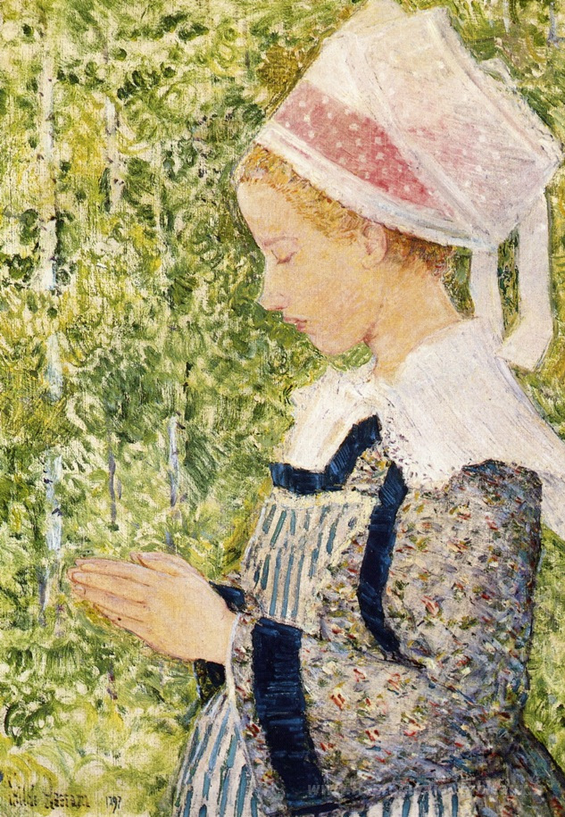 Nous vous proposons une reproduction artisanale sur toile du célèbre tableau 'Brittany paysan au pardon' de Childe Hassam, provenant du Musée de la Reproduction.