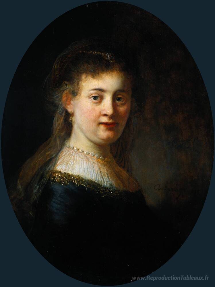 Nous vous proposons une reproduction artisanale sur toile du célèbre tableau 'Buste de jeune femme (probablement Saskia van Uylenburgh)' de Rembrandt, provenant du Musée de la Reproduction.