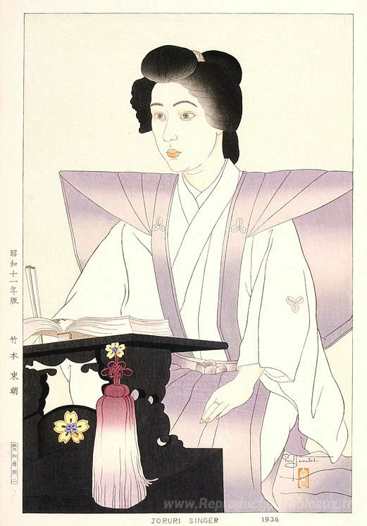 Nous vous proposons une reproduction artisanale sur toile du célèbre tableau 'Chanteur de Joruri' de Paul Jacoulet, provenant du Musée de la Reproduction.