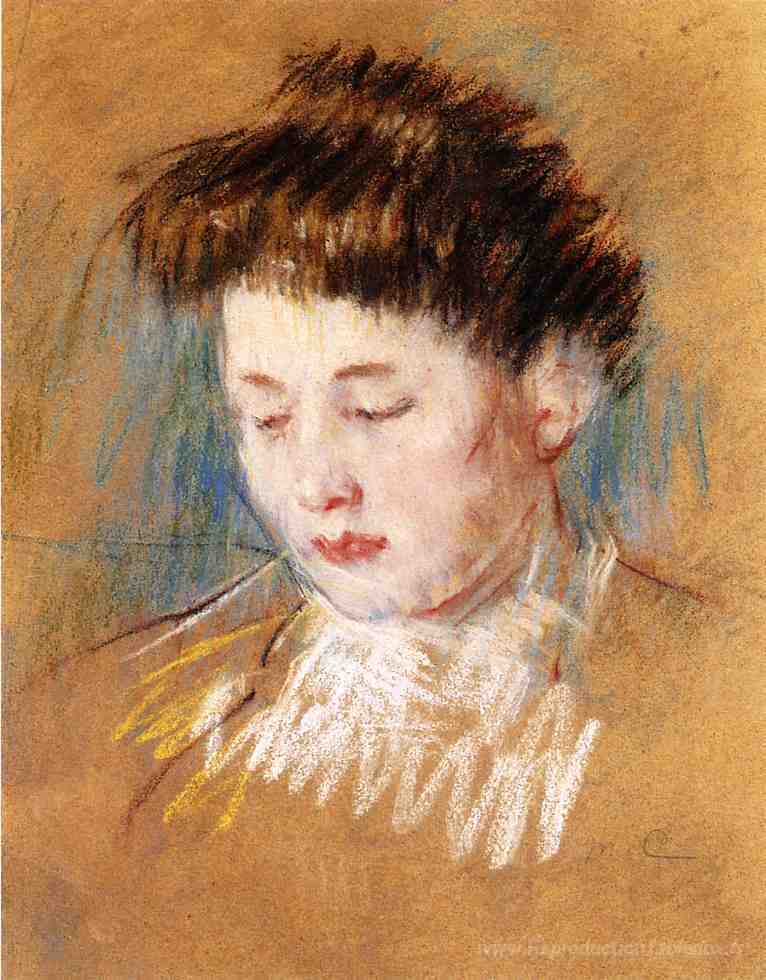 Nous vous proposons une reproduction artisanale sur toile du célèbre tableau 'Chef de Julie, en regardant vers le bas' de Mary Cassatt, provenant du Musée de la Reproduction.