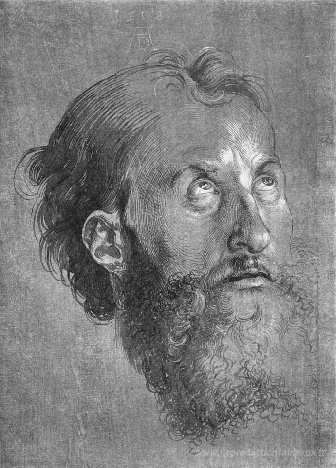 Nous vous proposons une reproduction artisanale sur toile du célèbre tableau 'Chef d'un apôtre regardant vers le haut' de Albrecht Durer, provenant du Musée de la Reproduction.