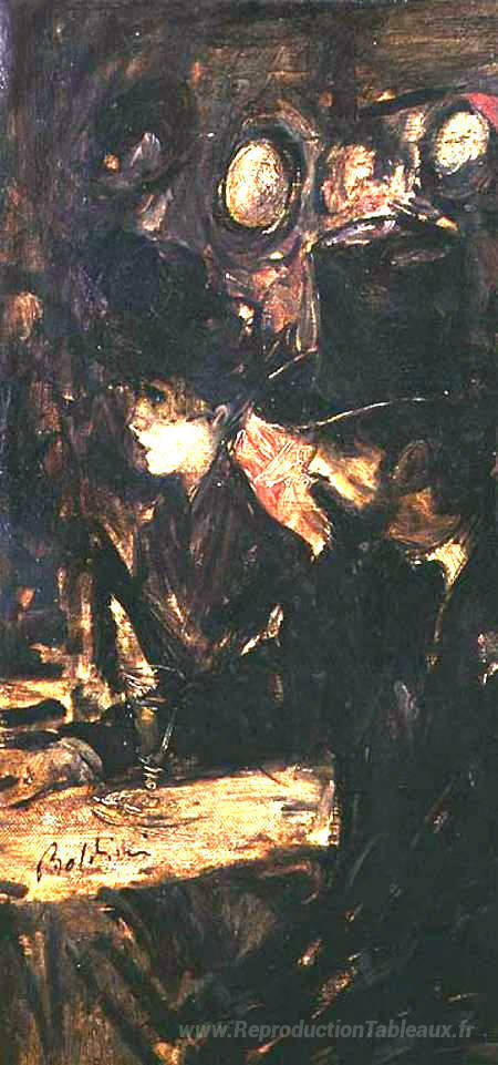 Nous vous proposons une reproduction artisanale sur toile du célèbre tableau 'Chez Maxim' de Giovanni Boldini, provenant du Musée de la Reproduction.