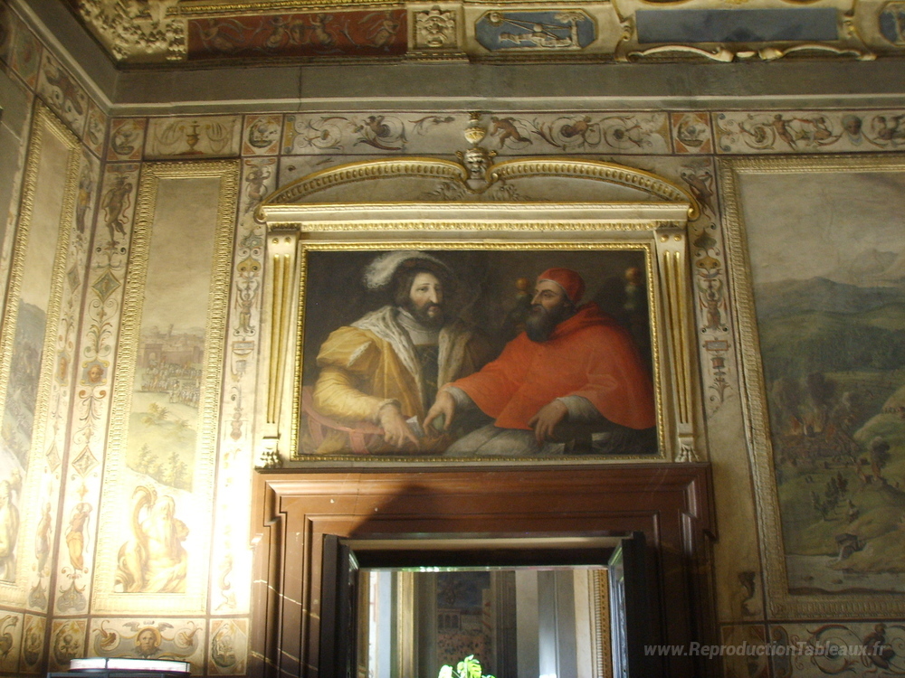 Nous vous proposons une reproduction artisanale sur toile du célèbre tableau 'Clemenet VII et Francis I de France' de Giorgio Vasari, provenant du Musée de la Reproduction.