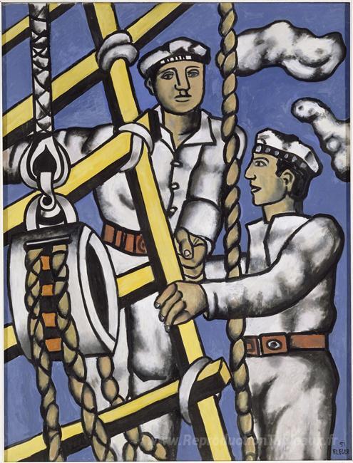 Nous vous proposons une reproduction artisanale sur toile du célèbre tableau 'Composition avec deux marins' de Fernand Leger, provenant du Musée de la Reproduction.