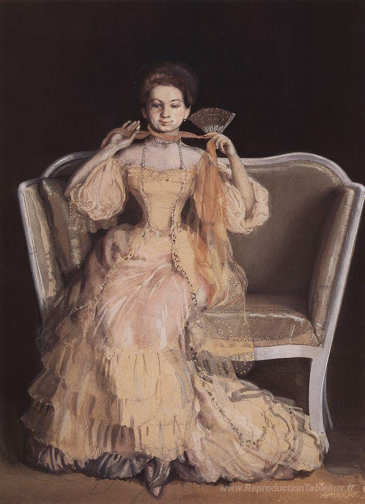 Nous vous proposons une reproduction artisanale sur toile du célèbre tableau 'Dame en rose' de Konstantin Somov, provenant du Musée de la Reproduction.