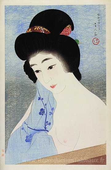 Nous vous proposons une reproduction artisanale sur toile du célèbre tableau 'Dans le bain' de Torii Kotondo, provenant du Musée de la Reproduction.