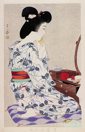 Nous vous proposons une reproduction artisanale sur toile du célèbre tableau 'Dans un léger été kimono avec des iris' de Torii Kotondo, provenant du Musée de la Reproduction.