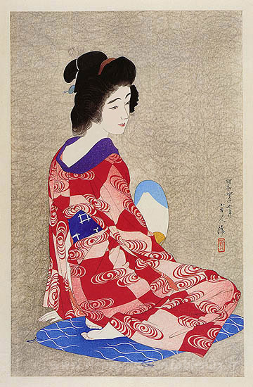 Nous vous proposons une reproduction artisanale sur toile du célèbre tableau 'Dans un long sous-vêtement' de Torii Kotondo, provenant du Musée de la Reproduction.