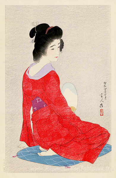 Nous vous proposons une reproduction artisanale sur toile du célèbre tableau 'Dans un long sous-vêtements (variante)' de Torii Kotondo, provenant du Musée de la Reproduction.