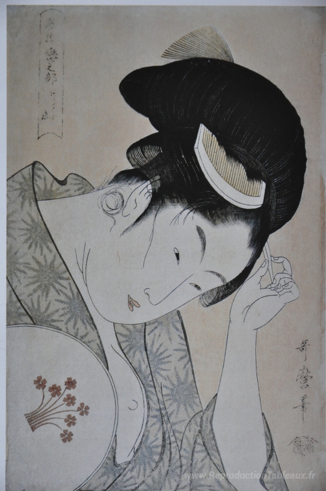 Nous vous proposons une reproduction artisanale sur toile du célèbre tableau 'De la série kasen koi no bu' de Kitagawa Utamaro, provenant du Musée de la Reproduction.