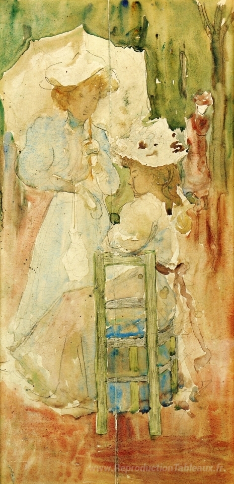 Nous vous proposons une reproduction artisanale sur toile du célèbre tableau 'Deux femmes dans un parc' de Maurice Prendergast, provenant du Musée de la Reproduction.