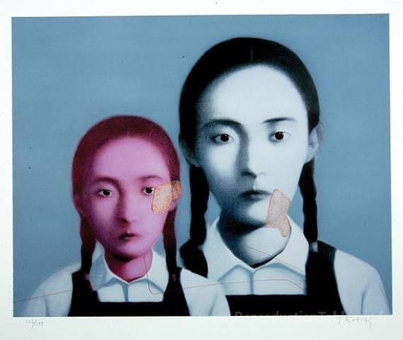 Nous vous proposons une reproduction artisanale sur toile du célèbre tableau 'Deux soeurs' de Zhang Xiaogang, provenant du Musée de la Reproduction.