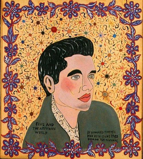 Nous vous proposons une reproduction artisanale sur toile du célèbre tableau 'Elvis et le monde Arpitaun' de Howard Finster, provenant du Musée de la Reproduction.