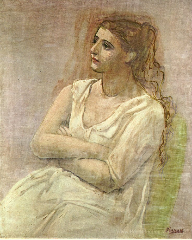 Nous vous proposons une reproduction artisanale sur toile du célèbre tableau 'Femme assise avec ses bras pliés (Sarah Murphy)' de Pablo Picasso, provenant du Musée de la Reproduction.