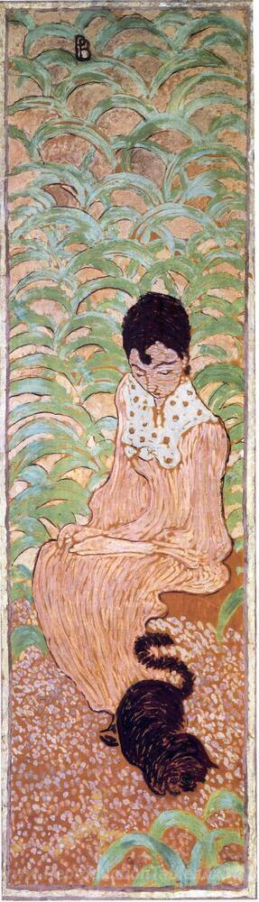 Nous vous proposons une reproduction artisanale sur toile du célèbre tableau 'Femme assise avec un chat' de Pierre Bonnard, provenant du Musée de la Reproduction.