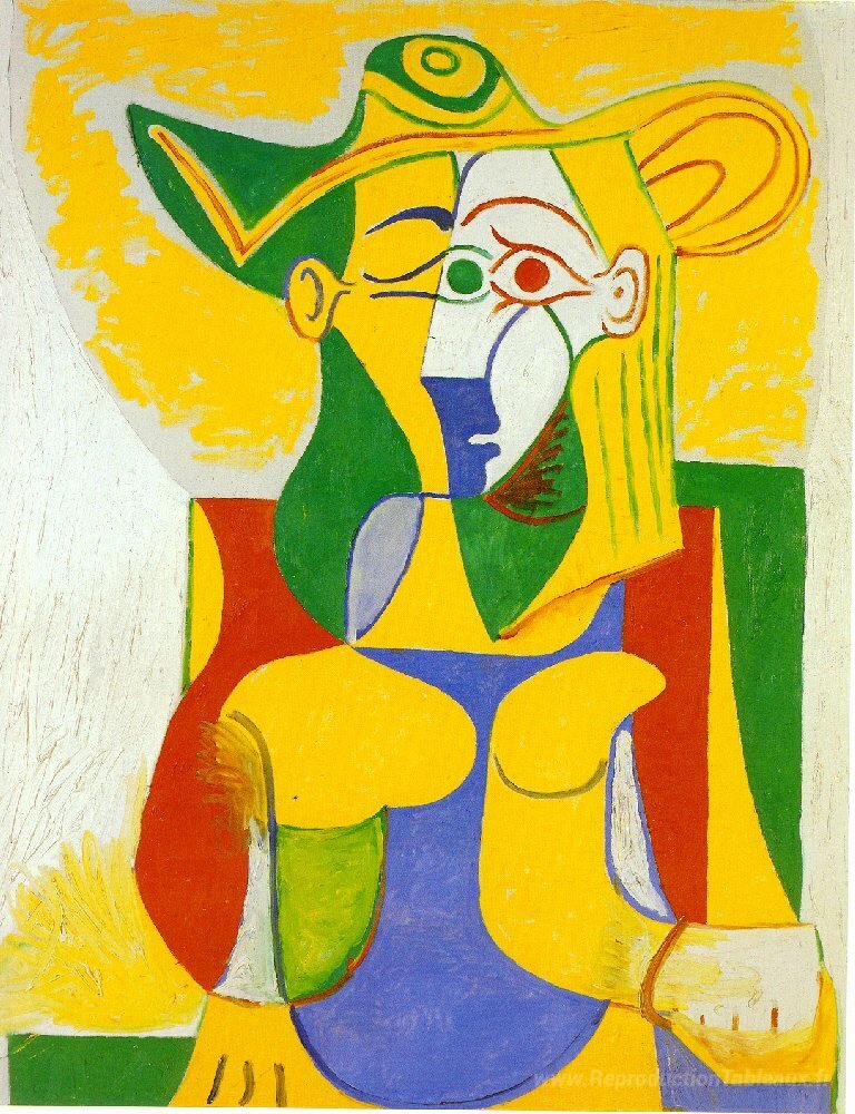 Nous vous proposons une reproduction artisanale sur toile du célèbre tableau 'Femme assise dans un fauteuil' de Pablo Picasso, provenant du Musée de la Reproduction.