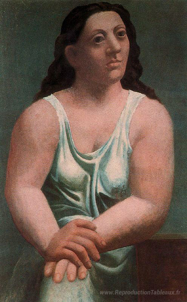 Nous vous proposons une reproduction artisanale sur toile du célèbre tableau 'Femme assise' de Pablo Picasso, provenant du Musée de la Reproduction.