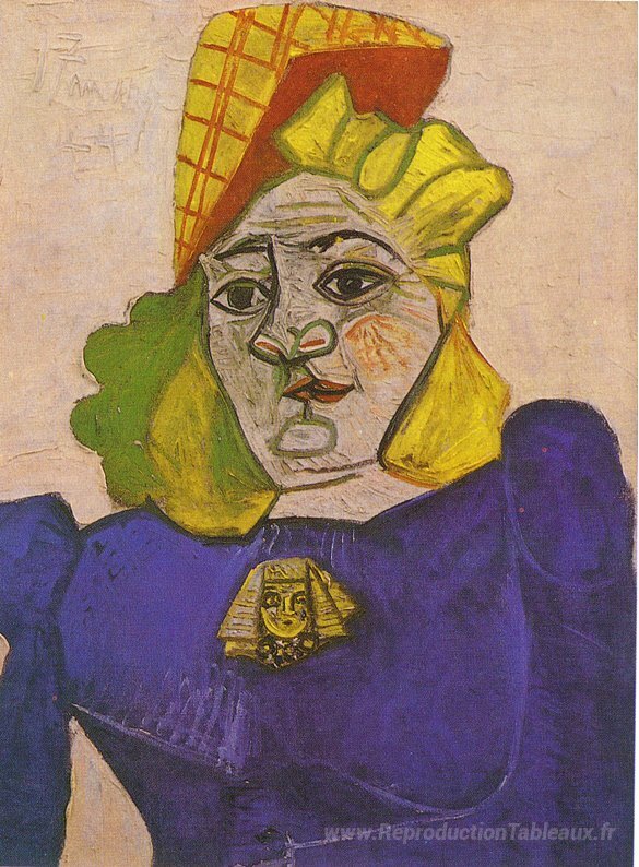 Nous vous proposons une reproduction artisanale sur toile du célèbre tableau 'Femme avec broche' de Pablo Picasso, provenant du Musée de la Reproduction.