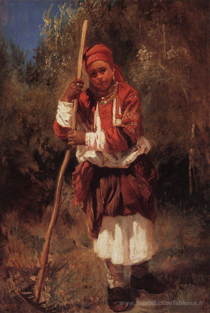 Nous vous proposons une reproduction artisanale sur toile du célèbre tableau 'Femme avec râteau' de Konstantin Makovsky, provenant du Musée de la Reproduction.