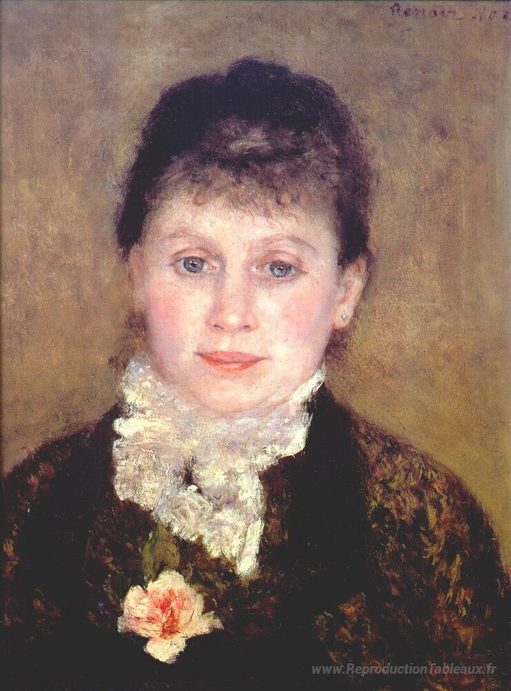 Nous vous proposons une reproduction artisanale sur toile du célèbre tableau 'Femme avec un jabot blanc' de Pierre-Auguste Renoir, provenant du Musée de la Reproduction.