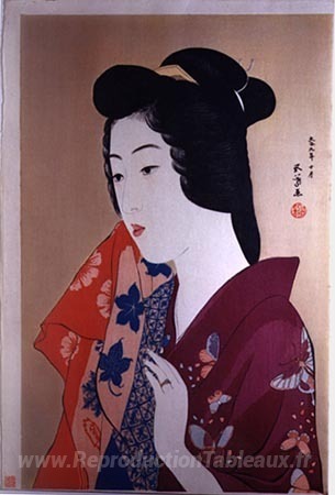 Nous vous proposons une reproduction artisanale sur toile du célèbre tableau 'Femme avec une serviette à main' de Goyo Hashiguchi, provenant du Musée de la Reproduction.
