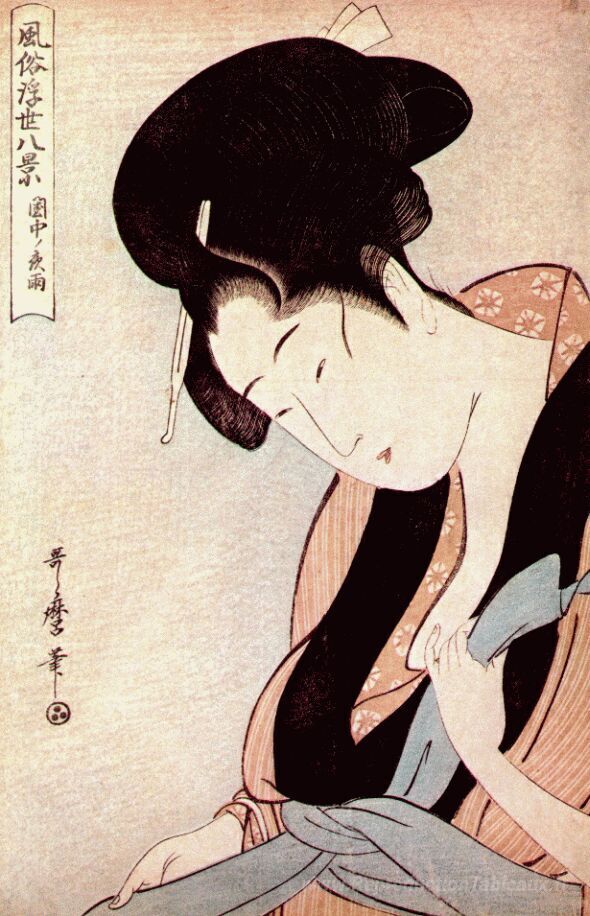 Nous vous proposons une reproduction artisanale sur toile du célèbre tableau 'Femme dans la chambre la nuit pluvielle' de Kitagawa Utamaro, provenant du Musée de la Reproduction.