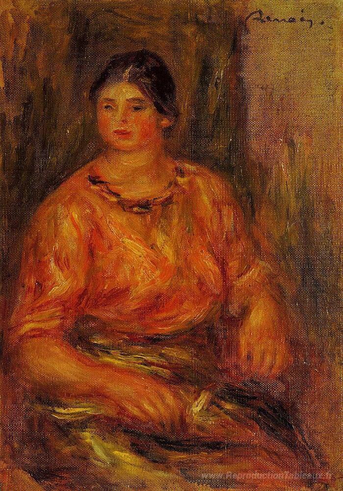 Nous vous proposons une reproduction artisanale sur toile du célèbre tableau 'Femme dans un chemisier rouge' de Pierre-Auguste Renoir, provenant du Musée de la Reproduction.