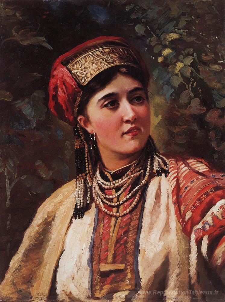 Nous vous proposons une reproduction artisanale sur toile du célèbre tableau 'Femme en costume national' de Konstantin Makovsky, provenant du Musée de la Reproduction.