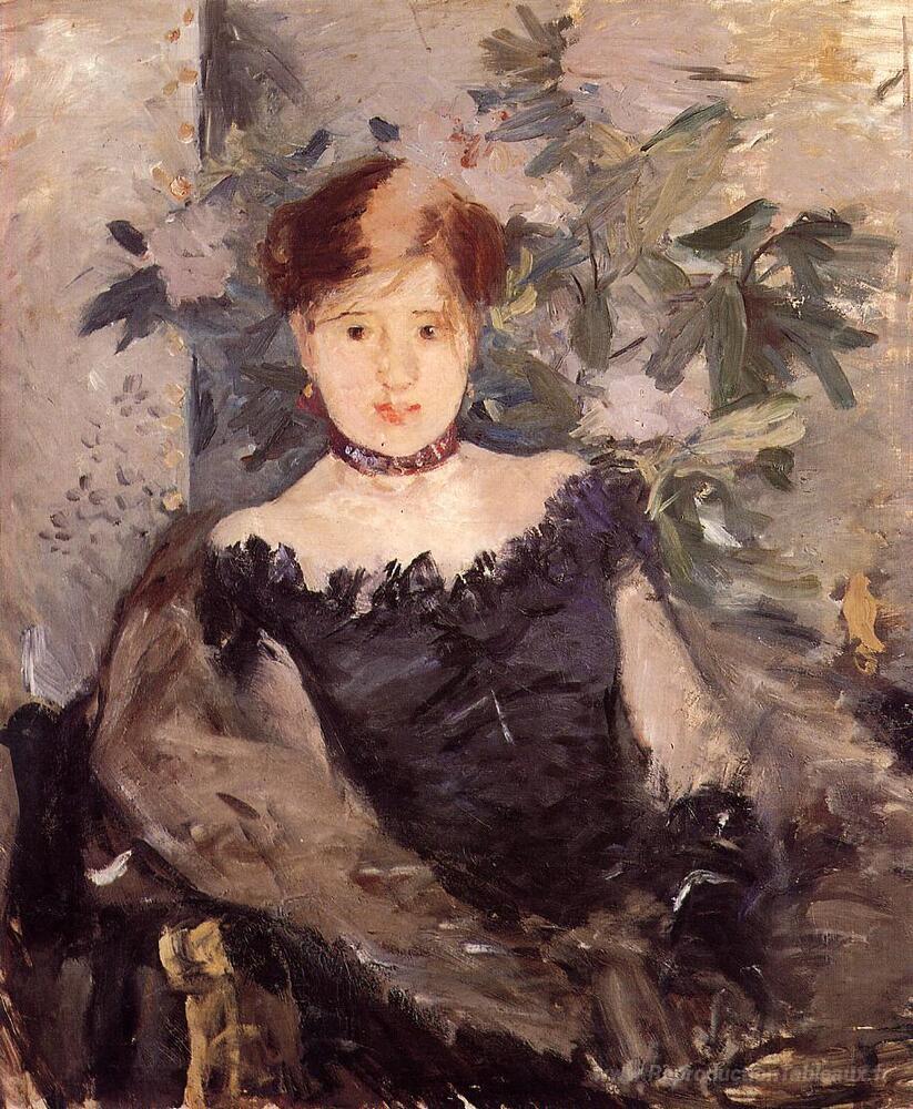 Nous vous proposons une reproduction artisanale sur toile du célèbre tableau 'Femme en noir' de Berthe Morisot, provenant du Musée de la Reproduction.