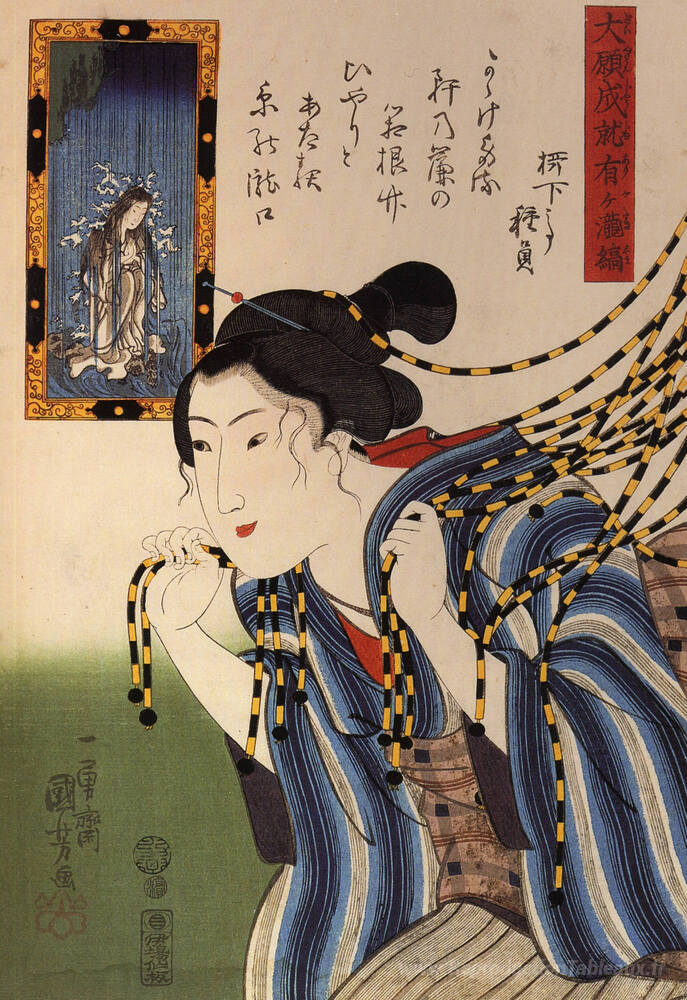 Nous vous proposons une reproduction artisanale sur toile du célèbre tableau 'Femme marchant à travers un Noren' de Utagawa Kuniyoshi, provenant du Musée de la Reproduction.