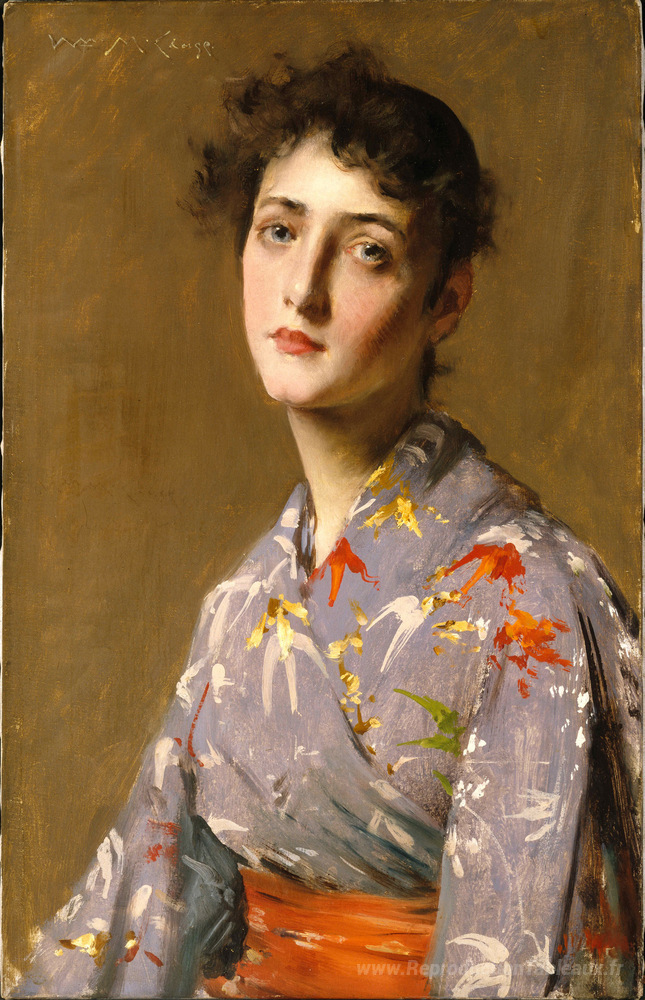 Nous vous proposons une reproduction artisanale sur toile du célèbre tableau 'Fille dans un costume japonais' de William Merritt Chase, provenant du Musée de la Reproduction.