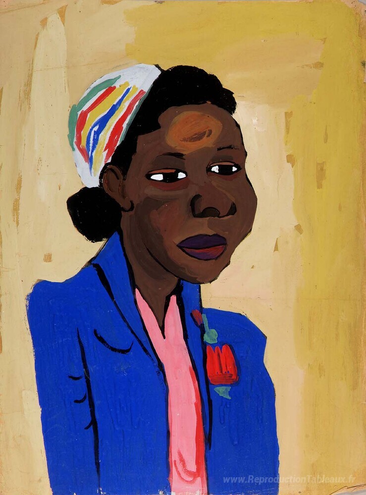 Nous vous proposons une reproduction artisanale sur toile du célèbre tableau 'Fille en bleu avec turban - deborah' de William H. Johnson, provenant du Musée de la Reproduction.