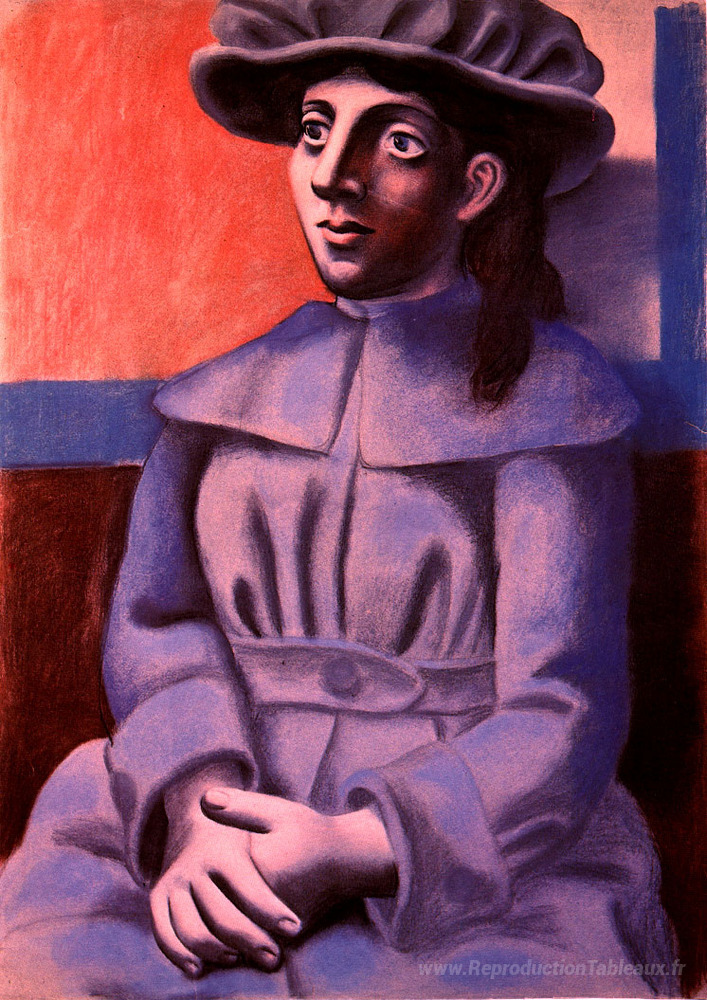 Nous vous proposons une reproduction artisanale sur toile du célèbre tableau 'Fille en chapeau avec ses bras croisés' de Pablo Picasso, provenant du Musée de la Reproduction.