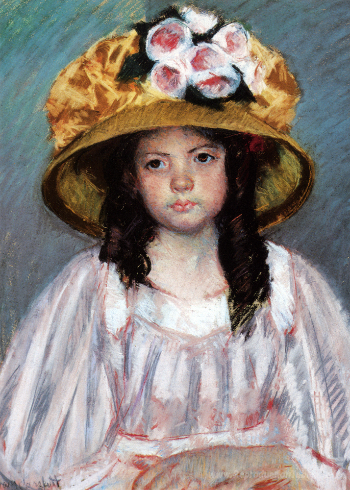 Nous vous proposons une reproduction artisanale sur toile du célèbre tableau 'Fille en grand chapeau' de Mary Cassatt, provenant du Musée de la Reproduction.